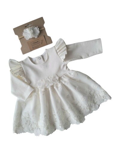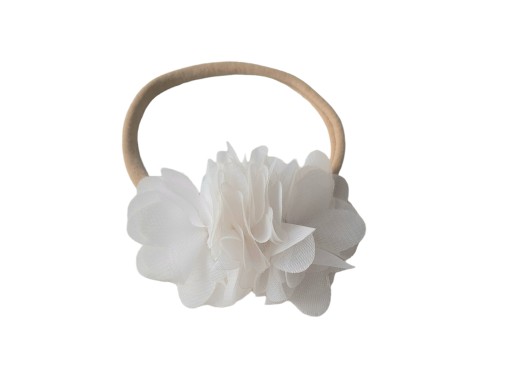 Opaska niemowlęca z kwiatuszkami .Kwiatuszki w kolorze ecru ,opaska w kolorze beżowym. Rozmiar pasuje od noworodka do kilku lat ,jest bardzo delikatna i rozciągliwa.