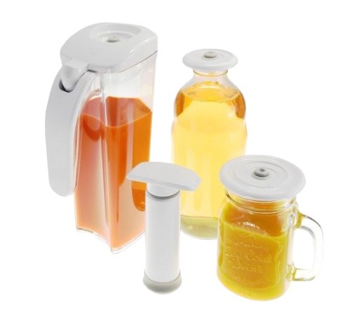 Rewelacyjny komplet 3 elementów z pompką próżniową, który pozwala na dłuższe przechowywanie soków, koktajli lub przetworów.
