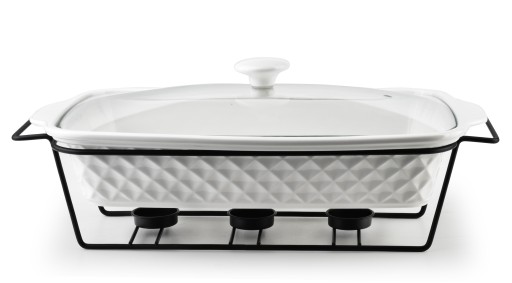 Piękne naczynie na stojaku z funkcją podgrzewania za pomocą świeczek to świetne rozwiązanie gdy chcemy podać potrawę podczas przyjęcia. Danie w naczyniu będzie długo ciepłe i smaczne.
