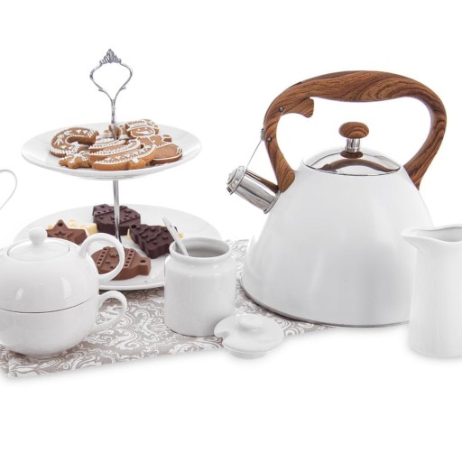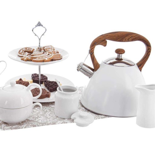 - STALOWY - Klasyczny czajnik wykonany ze stali nierdzewnej w białym kolorze. Posiada automatyczny gwizdek oraz zdejmowaną pokrywkę. Czajnik ma pojemność całkowitą 3,5 litra oraz wysokość 23 cm, pojemność użytkowa wynosi 3 litry.