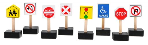 - znaki drogowe: stop, parking, zakaz wjazdu, zakaz parkowania, zakaz skrętu, światła, uwaga na dzieci.