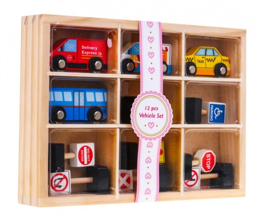 Zestaw pojazdów oraz znaków drogowych to propozycja dla dzieci już od 24 miesiąca życia. Zestaw wykonany został z wysokiej jakości drewna, pomalowanego bezpiecznymi, nietoksycznymi farbami. Posłuży Twojemu dziecku na długie lata. Zestaw składa się z 12 elementów: 4 pojazdów oraz 8 znaków drogowych. Zapakowany jest w drewniane pudełko, które może służyć jako regał na pojazdy i znaki.