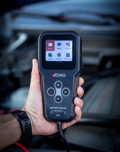- Testuj akumulator w pojeździe i poza nim (wybór w menu)
