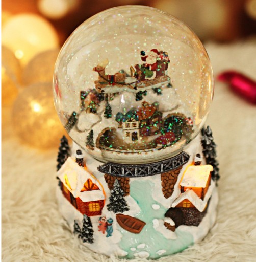 - Życzymy tradycyjnych Wesołych Świąt z naszą szklaną kulą śnieżną z tradycyjną sceną bożonarodzeniową - Święty Mikołaj na saniach przelatuje nad spokojną wioską.