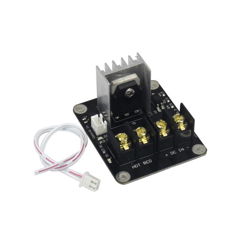 Przekaźnik elektroniczny MOSFET pozwala odciążyć układ zasilania grzałki filamentu lub podgrzewania stołu. Zastosowanie modułu pozwala podać prąd o natężeniu 25A przy napięciu od 12V do 24V DC. Jest dedykowany dla drukarek 3D m.in.: Anet A2, A6, A8 oraz moduły sterownicze Ramps. Instalacja MOSFET'u zalecana jest głównie posiadaczom drukarek typu RepRap. Moduł MOSFET stanowi podstawową modyfikację jak i ulepszenie dla drukarki 3D. Układ współpracuje zarówno z zasilaczami 12V DC jak i 24V DC.