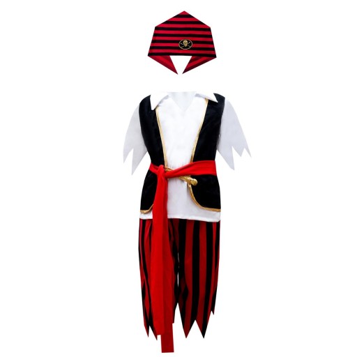 Strój dla dzieci "Pirat" 1-2 lata. Kostium na bal karnawałowy, imprezę urodzinową lub inną zabawę pozwalający wcielić się w postać Pirata, Korsarza. Strój składa się z następujących elementów: koszulka z kamizelką, spodnie, pasek, chusta na głowę.