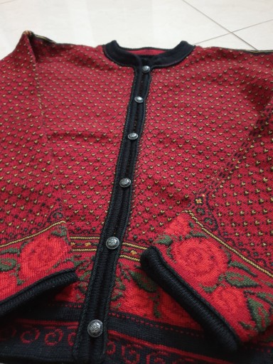 DALE OF NORWAY PURE EXCLUSIVE NEW WOOL CASUAL PIĘKNY JAK NOWY,dł całkowita 56cm,szer pod pachami 54cm(raglan),dł rękawa od szyi 70cm,zapinany na metalowe ozdobne guziki,dołem i przy rękawach,wzór z różami,PIĘKNY,JAK NOWY,POLECAM