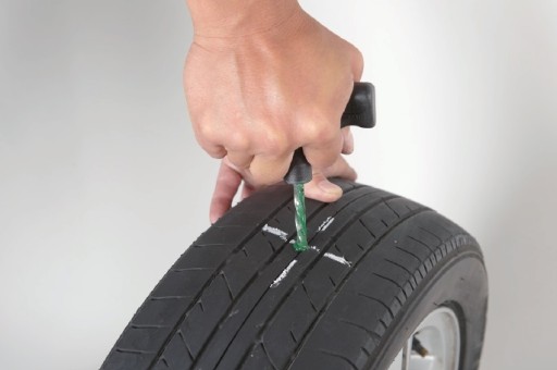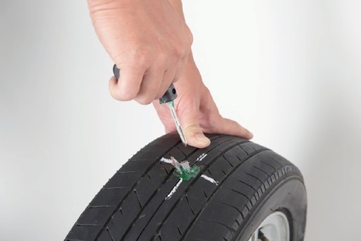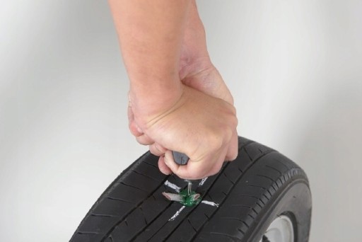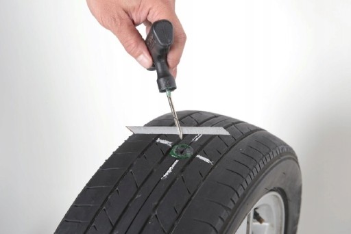 Ilustracja przedstawiająca proces naprawy opony za pomocą zestawu naprawczego