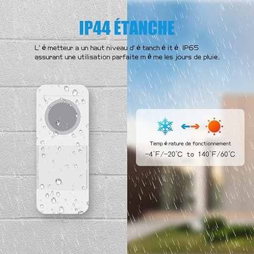 38 melodii i 4 poziomy: bezprzewodowy dzwonek do drzwi oferujących melodię, 38 opcji melodii i 4 regulowane poziomy, aby być dostępnym dla Twoich potrzeb. Oprócz melodii pojawia się również sygnał świetlny. Po na zatrzask bezprzewodowego dzwonka do drzwi dioda LED miga. Idealny dla osób z wadami słuchu.