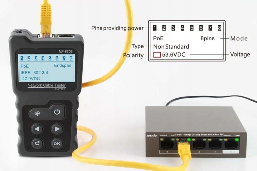 - 3 Możliwości testowania kabli — mapa połączeń, długość i PoE . NF-8209 umożliwia testowanie mapy połączeń i sprawdzanie 5 typowych problemów z połączeniem, w tym otwartych, krótkich, skrzyżowanych, rozdzielonych i odwróconych par, pomiar długości kabli LAN w zakresie 2,5 m - 500 m, testowanie informacji o urządzeniach PoE takie jak napięcie PoE, polaryzacja i tryb zasilania, typ PSE (standard AF lub AT).