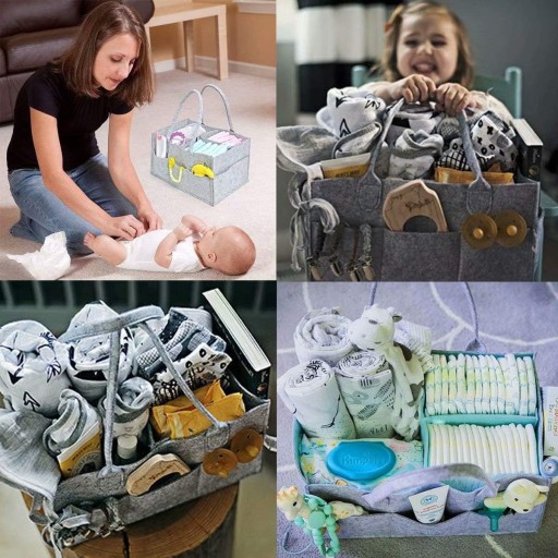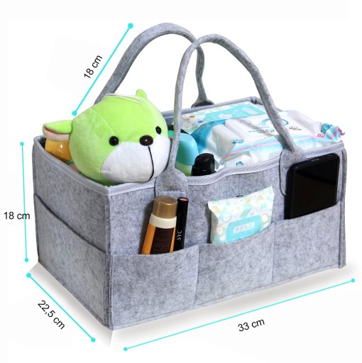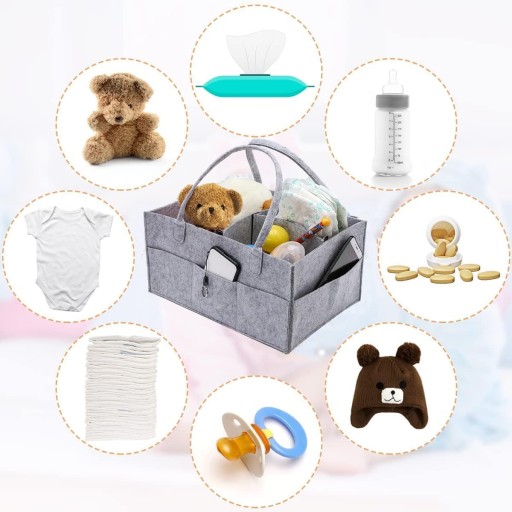 Organizer na pieluszki z filcu posiada wyjmowane przegródki, które można dostosować do indywidualnych potrzeb. Dzięki temu wszystkie niezbędne rzeczy są zawsze gotowe do użycia i uporządkowane.