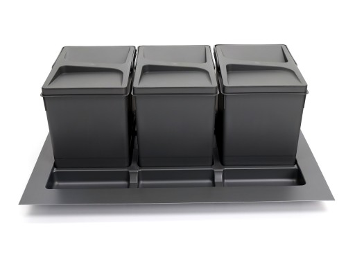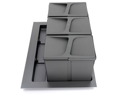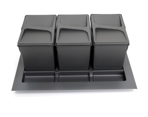 Segregacja odpadów UNICO firmy HAFELE zdecydowanie ułatwi utrzymanie czystości w szufladach oraz zagwarantuje funkcjonalną segregację. Zestaw został wyposażony w 3 pojemniki, każdy z nich posiada osobną pokrywę oraz składany uchwyt ułatwiający wyjęcie kosza z wnętrza szuflady. Sortowniki przeznaczone są do wszystkich rodzajów szuflad o minimalnej szerokości zewnętrznej szafki 800 mm. Świetnie sprawdzą się zwłaszcza pod zlewozmywakiem. Wkład jest elastyczny, tzn. umożliwia docięcie do potrzebnych wymiarów (zapas na krawędziach). Minimalny wymiar podstawy to 640 x 410 mm, a maksymalny 736 x 480 mm. Wysokość pojemników to 266 mm. Segregator sprawdzi się w szufladzie o głębokości 450 lub 500 mm.
