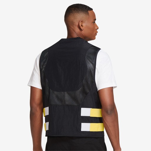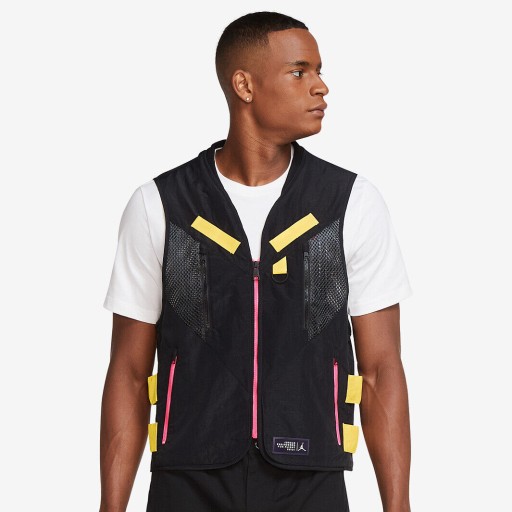 Air Jordan odchodzi od kortów w tej czarnej kamizelce, szukając inspiracji w utylitarnym stylu. Jest uszyty z nylonowej tkaniny z siateczkowymi panelami zapewniającymi oddychalność, a następnie ozdobiony żywymi żółtymi i różowymi akcentami. Na klatce piersiowej znajduje się również pętla typu D-ring zapewniająca dodatkową przestrzeń do noszenia.