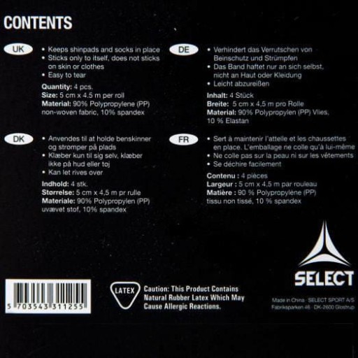 4/pack TAŚMA DO GETR/NAGOLENNIKÓW 5cm x 4,5 m Nowa taśma do nagolenników w sześciu różnych kolorach. Rewolucyjne połączenie lateksu zapewnia dobrą przyczepność materiału. Do utrzymywania nagolenników i skarpet we właściwym miejscu. Taśmę można naklejać bezpośrednio na skórę.