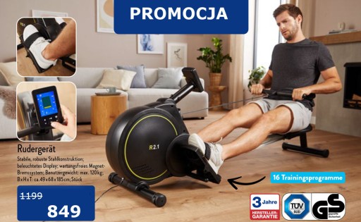 Wioślarz posiada również wygodną rączkę z piankowym pokryciem, wyściełane siedzisko wioślarskie z łożyskami kulkowymi oraz bieżniki z paskami zabezpieczającymi. Pomiar tętna możliwy jest poprzez wbudowany odbiornik. Do pomiaru tętna wymagany jest dodatkowy smartwatch lub pasek na klatkę piersiową. Nie wchodzą one w zakres dostawy.