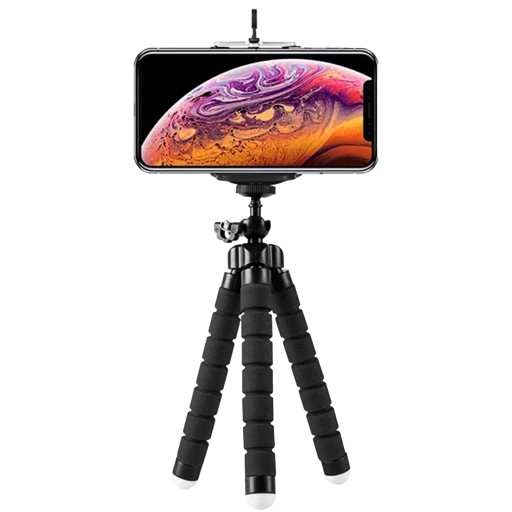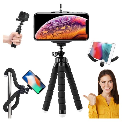 Mini statyw/uchwyt na telefon komórkowy, aparat fotograficzny, kamerę. Dzięki swoim elastycznym nóżkom można go stabilnie zamocować, praktycznie na każdym elemencie otoczenia.