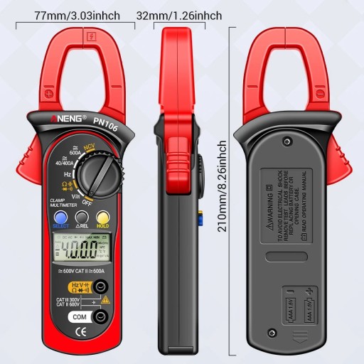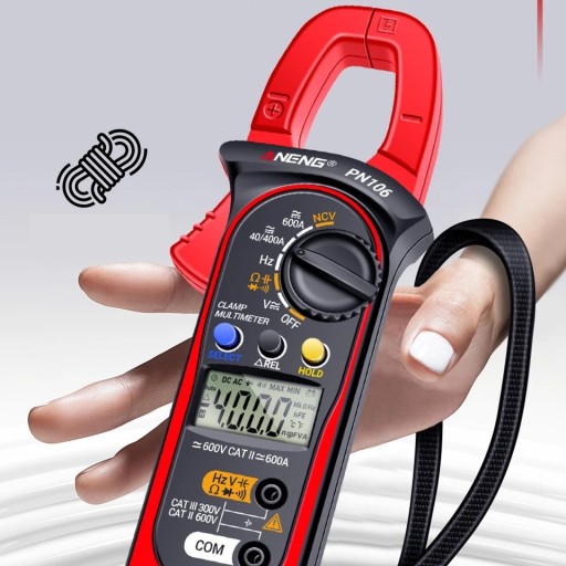 Miernik PN106 został wyposażony w cęgi, dzięki którym pomiar prądu AC/DC jest szybki, wygodny oraz bezpieczny. W celu dokonania pomiaru wystarczy objąć pojedyńczy przewód i odczytać wartość na wyświetlaczu cyfrowym.