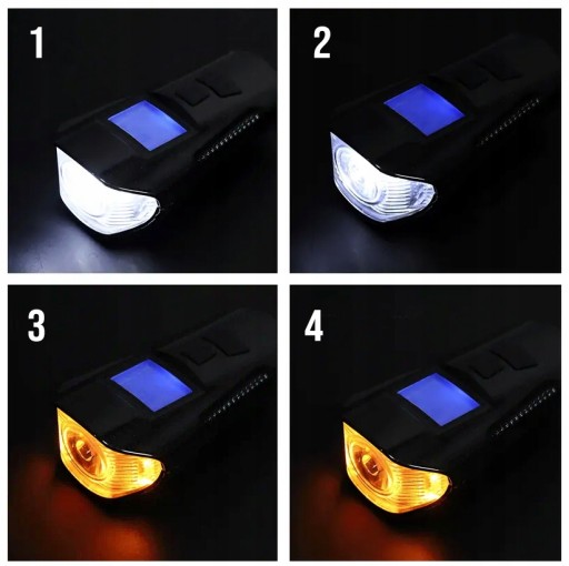 - CZTERY TRYBY OŚWIETLENIA – przednia lampka rowerowa LED posiada aż cztery różne tryby świecenia, między którymi można łatwo przełączać. Do wyboru jest: mocne światło, stroboskop, słabe światło oraz światło żółte.