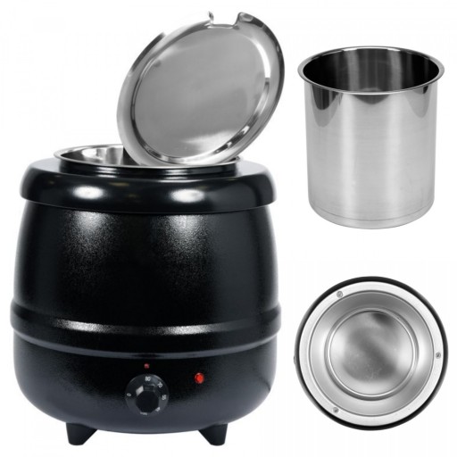 Stalowa obudowa malowana na czarno, wyjmowany pojemnik na zupę i pokrywa z otworem na chochlę. Idealny do serwowania zup, kremów i sosów.