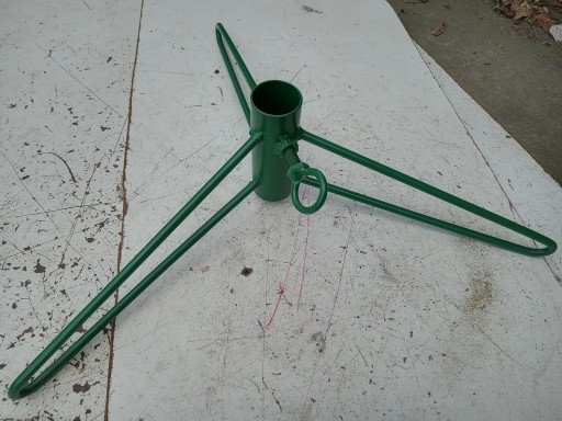 Solidny metalowy stojak pod choinkę pomalowany na zielono. Śruba dociskowa. Produkcja rzemieślnicza z PRL . Wysokość 14 cm, rozstaw nóżek 50 cm, otwór na drzewko 3,8 cm .