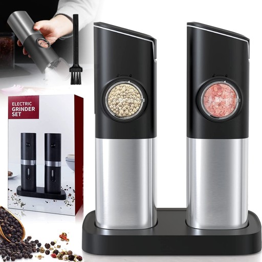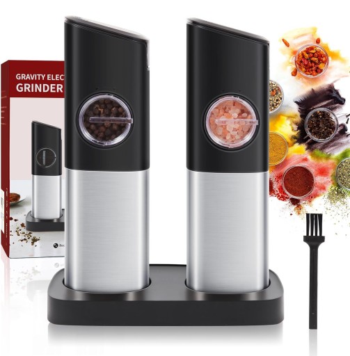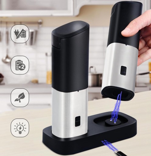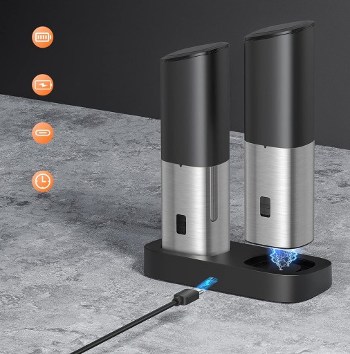 🎁🎁🎁 [Co otrzymujesz w pudełku]: 1* Zestaw elektrycznych młynków do soli i pieprzu, 1* podstawa ładująca, 1* kabel ładowarki USB C, 1* instrukcja obsługi