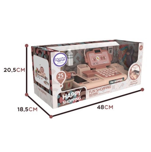 Kasa Sklepowa z wieloma akcesoriami od Woopie to idealna propozycja dla dzieci od 3 roku życia. Zabawka rozwija wyobraźnię dzieci i zachęca je do kreatywnego myślenia. Dzieci mogą ważyć owoce i warzywa, a następnie wbić je za pomocą klawiatury do komputera. Przy pomocy czytnika zeskanują paczkę ciasteczek lub butelkę wody. Następnie będą mogły zapłacić na trzy sposoby: tradycyjnie za pomocą pieniążków, karty płatniczej lub smartphonem. Wszystko to jest dołączone do zestawu i zapewni dziecku długie godziny fajnej zabawy.