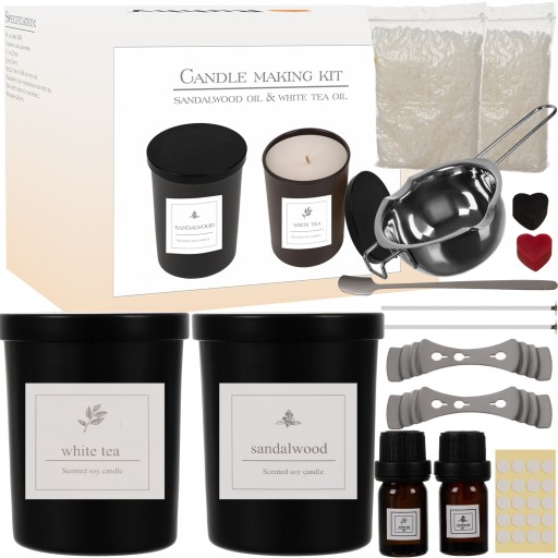 - 36 W 1 - ten duży zestaw posiada aż 36 elementów. Pozwala on stworzyć 2 kompletne świece. W zestawie znajdują się: 2x słoiki z pokrywką wielokrotnego użytku; 2x naklejki na słoiki; 2x olejki perfumowane; 2x knoty bawełniane; 2x torebki wosku; 2x zagniatarki do wosku; 1x naczynie do topienia wosku; 1x łyżeczka; 20x okrągłych naklejek do knotów; 2x barwnik.