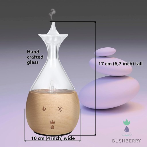 - Zrównoważony Design: Elegancki design dyfuzora Bushberry Mist z szkła i drewna doskonale komponuje się z każdym wnętrzem.