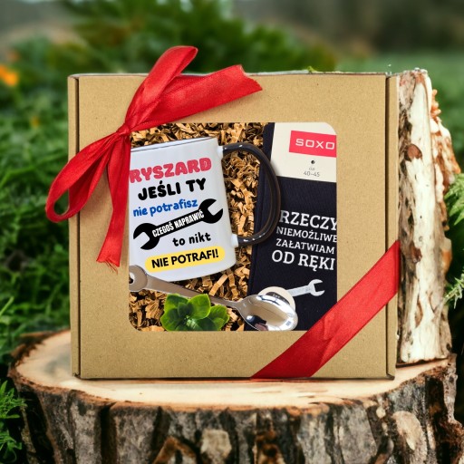 ZESTAW PERSONALIZOWANY (TWOJE IMIĘ) JEŚLI TY NIE POTRAFISZ CZEGOŚ NAPRAWIĆ TO NIKT NIE POTRAFI - kubek łyżeczka skarpetki