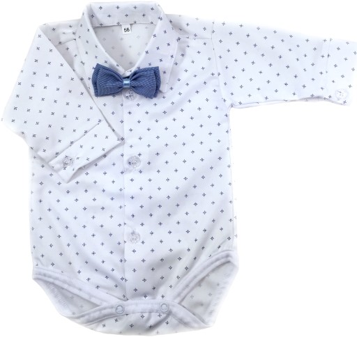Wizytowe koszulo-body z kołnierzykiem dla chłopczyka. Długie rękawy z mankietami zapinanymi na guziczki. W komplecie mucha na wstążeczce - niebieska w krateczkę. Możliwość wymiany koloru muchy na inny dostępny na aukcjach.
