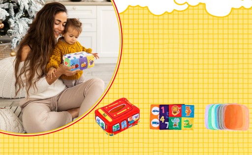 ✨Bezpieczna zabawka dla niemowląt: ta zabawka dla dziecka w pudełku na chusteczki jest wykonana z nietoksycznych, trwałych materiałów, bezpieczna, kolorowa i miękka. Można prać bez blaknięcia. Dziecko może swobodnie dotykać i bawić się, nie zranią go ostre zabawki.