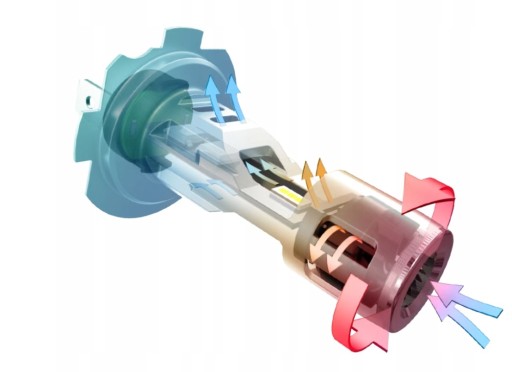 - JEDYNA w swoim rodzaju, unikalna kompaktowa konstrukcja z turbinowym systemem chłodzenia w korpusie, umożliwiająca montaż tam gdzie inne żarówki LED się nie mieszczą