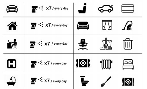 Stosowanie: Aby utrzymać świeży zapach, zalecamy 7 psiknięć dziennie w kierunku odświeżanej powierzchni.