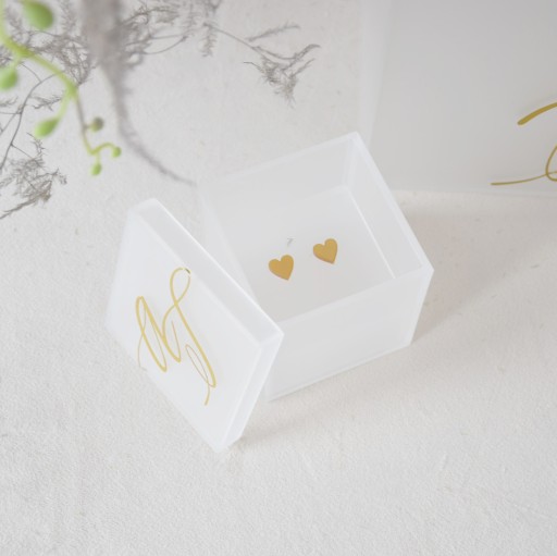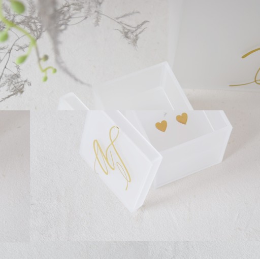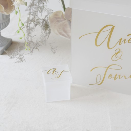- pudełko na koperty i obrączki wykonane jest z plexi matowej z napisami i dekoracjami w kolorze złota.