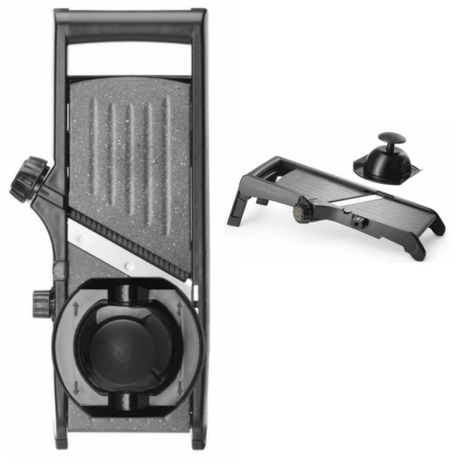 - Wyposażona w dodatkową, wysuwaną, szeroką nóżkę – wysoki komfort użytkowania, można szatkować warzywa trzymając mandolinę w ręce lub ustawić ja na blacie pod kątem 45°