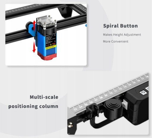 Anodowane CNC urządzenie podnoszące w osi Z napędzane jest przez prowadnicę wału pręta, a ogniskowanie lasera można zrealizować poprzez regulację górnego pokrętła, które jest odpowiednie do regulacji ogniskowej podczas cięcia obiektów o różnej grubości