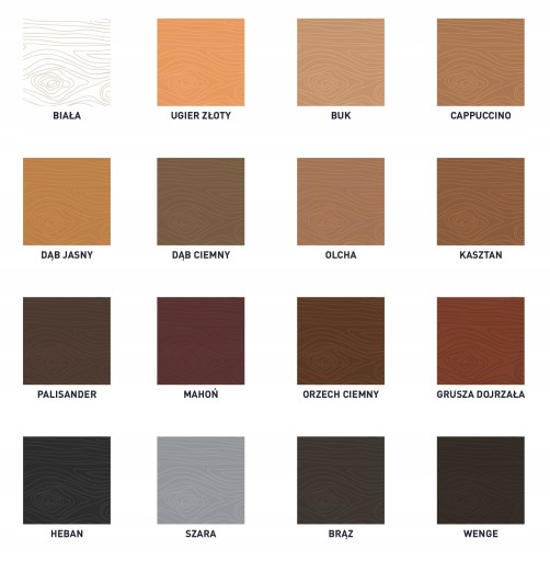 Kolory pokazane na wzorniku mogą różnić się od wymalowanych na drewnie. Wszystko zależy od ustawień monitora, ilości nałożonych warstw, sposobu aplikacji produktu i koloru malowanego drewna.