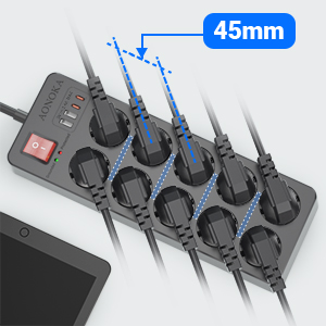 - Łatwa w użyciu listwa zasilająca z wyłącznikiem: duży wyłącznik bezpieczeństwa z kontrolą za pomocą jednego przycisku zapewnia spokój i pozwala lepiej oszczędzać energię. Z tyłu listwy znajdują się dwie dziurki od klucza do zawieszenia na ścianie, 10 gniazdek ustawionych pod kątem 45°, racjonalna konstrukcja pozwala zaoszczędzić dużo miejsca na biurku.