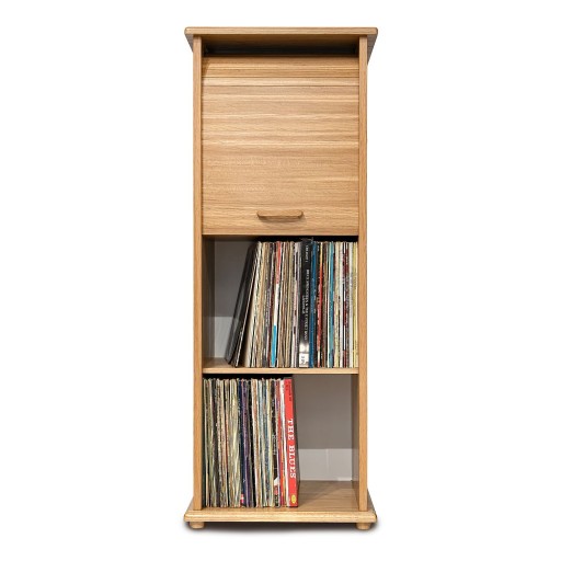 Do szafki możesz włożyć większe i mniejsze płyty winylowe, płyty szelakowe a na górny wieniec gramofon, dzięki czemu masz wszystko w jednym miejscu.