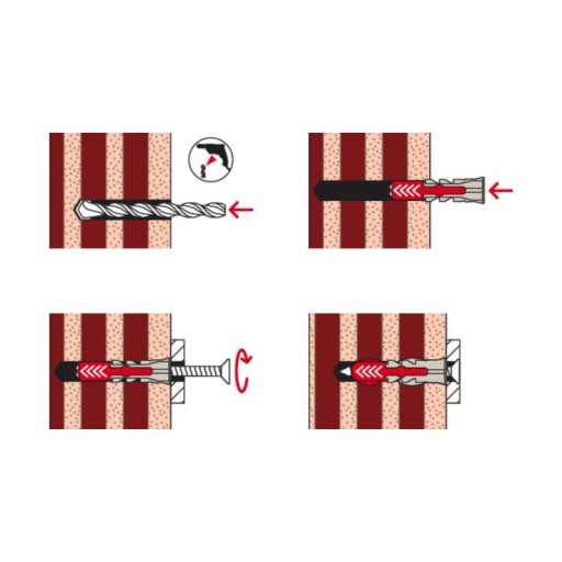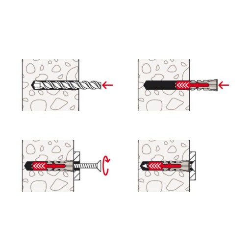 Fischer DuoPower oferuje bardzo dobre wartości trzymania dzięki dwóm składnikom: W zależności od materiału budowlanego, szare elementy wykonane z wysokiej jakości nylonu automatycznie aktywują optymalną funkcję produktu (rozciąganie, składanie, wiązanie) w celu uzyskania najlepszego mocowania. Skrzydełka rozszerzające czerwonego komponentu wspierają bezpieczną rozbudowę i zapewniają dodatkowe bezpieczeństwo szarego komponentu. Łatwe wkręcanie śruby i prawidłowe „dokręcenie” do zamknięcia. Brak nadmiernego dokręcenia śruby. Wstępnie ukształtowana krawędź główki kołka zapobiega wsuwaniu się kołka do wywierconego otworu.
