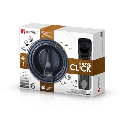 Z garnkami i patelniami click & cook Bergner sprawisz, że Twoje codzienne gotowanie będzie znacznie prostsze. Naczynia można przechowywać w wygodny sposób, by zaoszczędzić miejsce w szafkach. Każdego garnka i patelni możesz użyć do smażenia, gotowania, pieczenia, serwowania i przechowywania w lodówce.