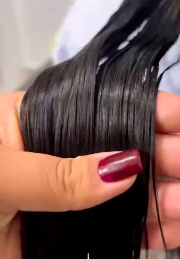 Zrób przerwę od 30 minut do 1 godziny, w zależności od stanu włosów, a następnie spłucz, całkowicie usuwając produkt. Wysusz włosy suszarką na 100%. Prostuj cienkie pasma profesjonalną prostownicą 12-15 razy w temp 200-230C w zależności od rodzaju włosów. Włosy oporne, falowane 230C.