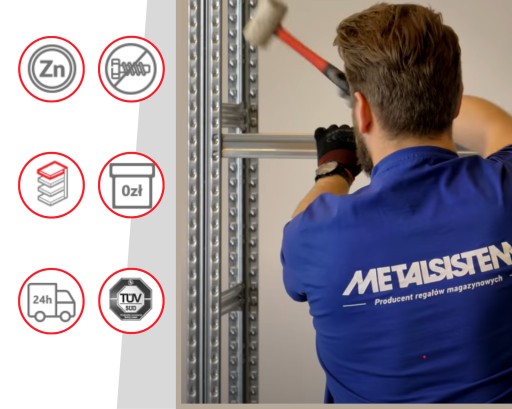 W zestawie stalowe spinki zabezpieczające poziom składowania przed przypadkowym wybiciem. Łatwy i bezpieczny montaż i demontaż.