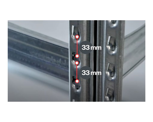 Rozstaw perforacji co 33 mm, co oznacza, że samodzielnie można ustalić położenie belek - poziomu składowania, w zależności od preferencji użytkownika, przy czym maksymalny rozstaw poziomów wynosi 70 cm.