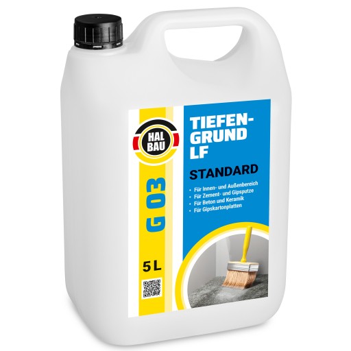 TIEFEN-GRUND LF STANDARD G03 to paroprzepuszczalny, drobnocząsteczkowy środek gruntujący w kolorze mlecznobiałym. Przeznaczony jest do wyrównywania chłonności oraz poprawiania przyczepności podłoża przeznaczonego do stosowani kolejnych warstw w procesach budowlanych. TIEFEN-GRUND LF STANDARD G03 można stosować wewnątrz oraz na zewnątrz pomieszczeń, na stare i nowe chłonne podłoża budowlane: betony, płyty (cementowe, gipsowe, gipsowo-kartonowe), tynki cementowo-wapienne i gipsowe. Może być stosowany w ogrzewanych konstrukcjach podłogowych. TIEFEN-GRUND LF STANDARD G03 polecany jest jako podkład farby i tapety, pod kleje cementowe i dyspersyjne, gładzie i szpachlówki polimerowe i gipsowe, tynki gipsowe, pod tynki cementowe, jastrychy. Po wyschnięciu grunt G03 nie tworzy powłoki. TIEFEN-GRUND LF STANDARD G03 polecany jest jako warstwa gruntująca pod polimerową szpachlówkę HALBAU Fertigspachtel Füll und Finish Perfect Weiß F01.
