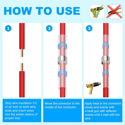 Ze względu na wysoką wodoodporność, złącza przewodów z uszczelnieniem lutowniczym mogą być używane w projektach okablowania samochodowego, łodzi, domu, przyczepy, kampera lub motocykla. Jest to również świetny prezent dla ojca lub osoby lubiącej majsterkowanie.