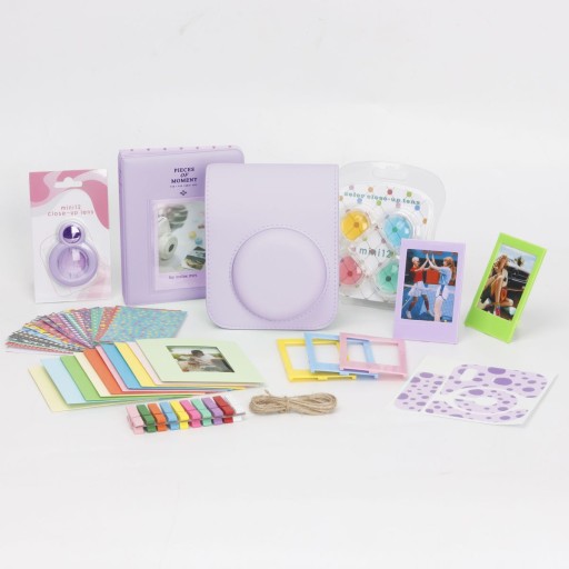 ?Co otrzymujesz?:Pakiety aparatów mini 12 zawierają Fioletowa torba na aparatCztery kolorowe filtry,64 albumy czasowe,Ramki na zdjęcia Kraft (10 sztuk),Lusterko do selfie,Mała ramka na zdjęcia w 5 kolorach (5 sztuk)