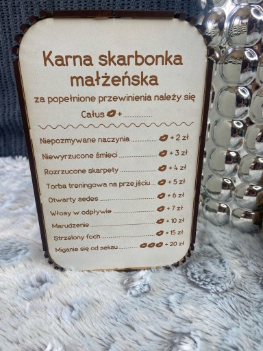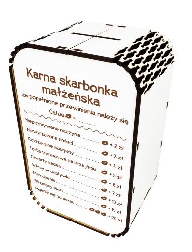 Drewniana skarbonka świetnie sprawdzi się jako prezent. Obdarowana osoba będzie mile zaskoczona Twoją pomysłowością. Sprawdzi się również jako element wystroju mieszkania. Można umieścić go w widocznym miejscu by przypominał partnerowi jaka czeka go kara za wybrane przewinienia.