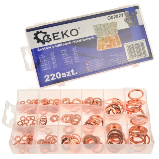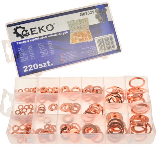 Zestaw 220 podkładek miedzianych w 16 różnych rozmiarach.