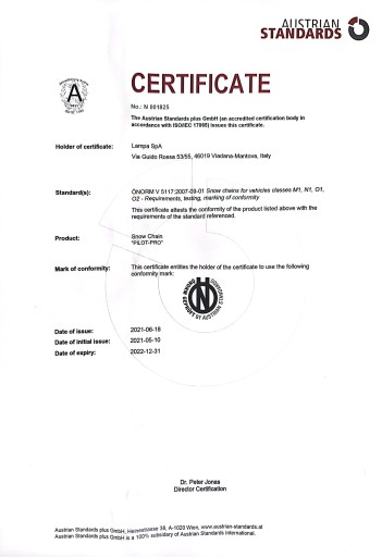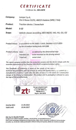 Do każdego kompletu łańcuchów dołączony jest certyfikat na EU oraz Austrię.